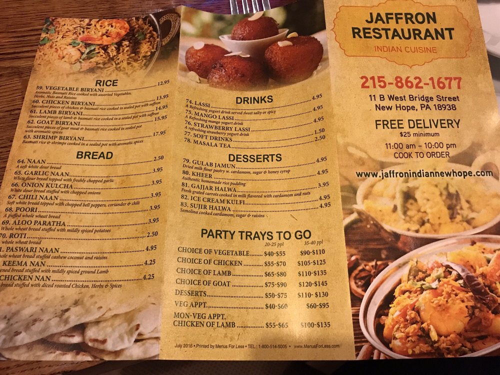 Introducing the menu at Jaffron Indian Restaurant, a hidden gem in New Hope, PA. Their appetizers include Samosa Veggie and Meat Samosas, Onion Bhajia, and Mango Shrimp. For bread options, try the Garlic Naan or the Chili Naan. The Chicken dishes are a must-try, such as the Chicken Tikka Masala and Chicken Korma. Customers rave about the friendly atmosphere and unbeatable prices. Reviews mention the delicious flavors, fresh ingredients, and quick service, making it a go-to spot for Indian cuisine enthusiasts. Don't miss out on the opportunity to experience authentic Indian flavors at Jaffron Indian Restaurant.
